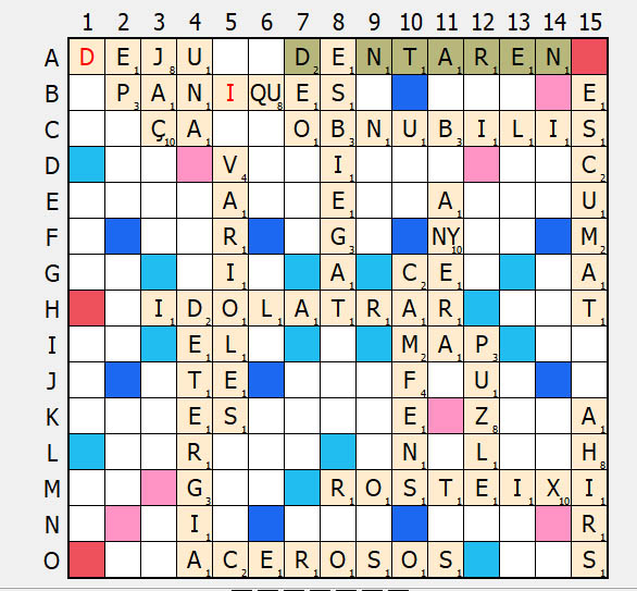 A la setzena ronda, venen bones fitxes, però ja està tot força ple i no hi ha gaires opcions per fer un scrabble… O potser sí? El desè i darrer scrabble de la partida és DENTAREN, deixant unes quantes consonants per col·locar. Però, segons les normes de la duplicada, quan s’acaben les vocals, s’acaba la partida.